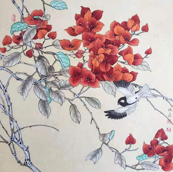 看現(xiàn)在林晶的繪畫,工筆花鳥畫可以說達到了惟肖惟妙,而且還有自己獨具的氣質(zhì)內(nèi)涵。她的工筆花鳥畫,已經(jīng)是掌握了精湛的傳統(tǒng)技法,諸如布局、章法、線描,以及對留白的把控等,都是很到位的。而且她還將個人審美觀融了進去,尤其是秦巴漢水的文人意趣體現(xiàn),更有自己的色彩感覺,而其表現(xiàn)核心仍是傳統(tǒng)的藝術(shù)審美觀。