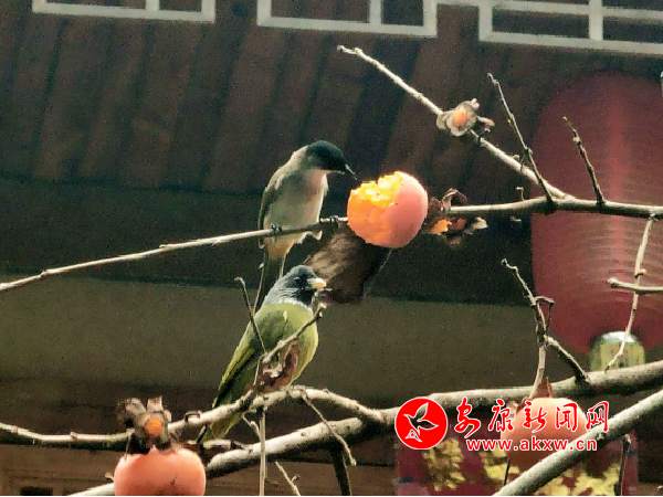山垰間,一樹焰火似的紅柿子,掛在天穹,迎風(fēng)搖曳,恰巧,兩只山雀停住枝丫間,兩眼凝視啄開紅彤彤的鮮瓤,不知道是望柿,還是炫酷孤傲的“旺勢(shì)”,樣子煞是迷人。