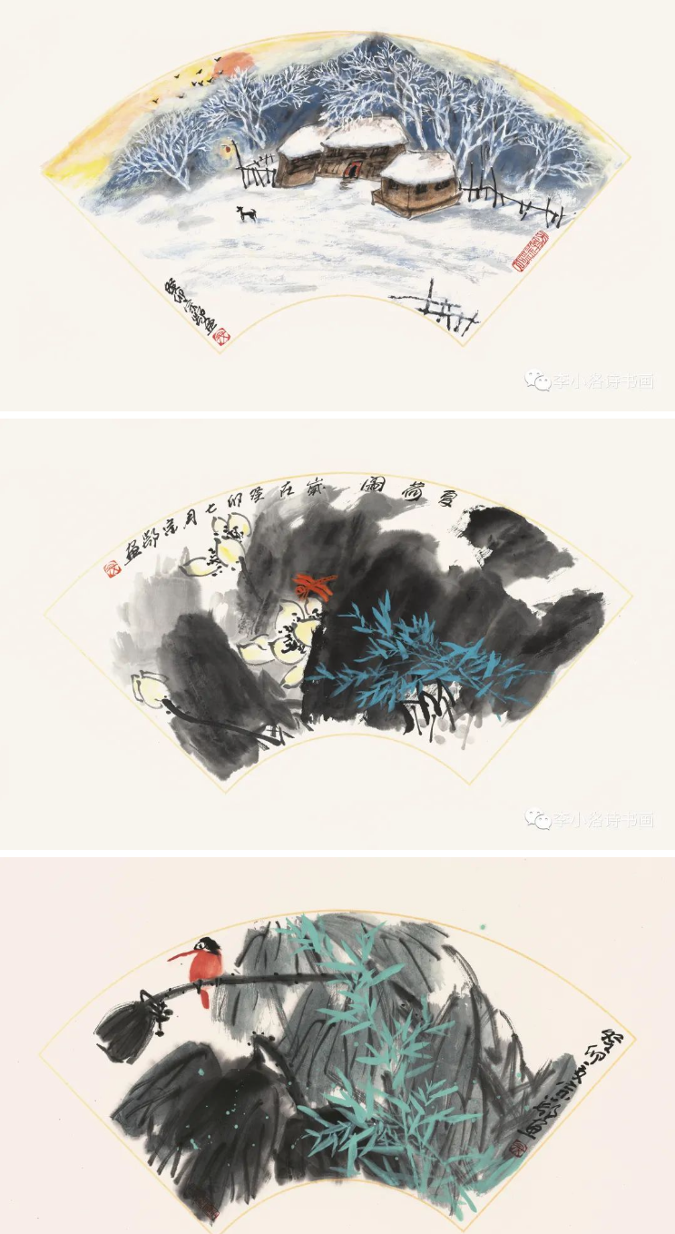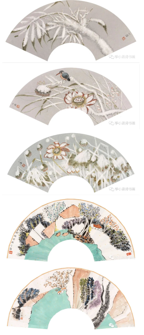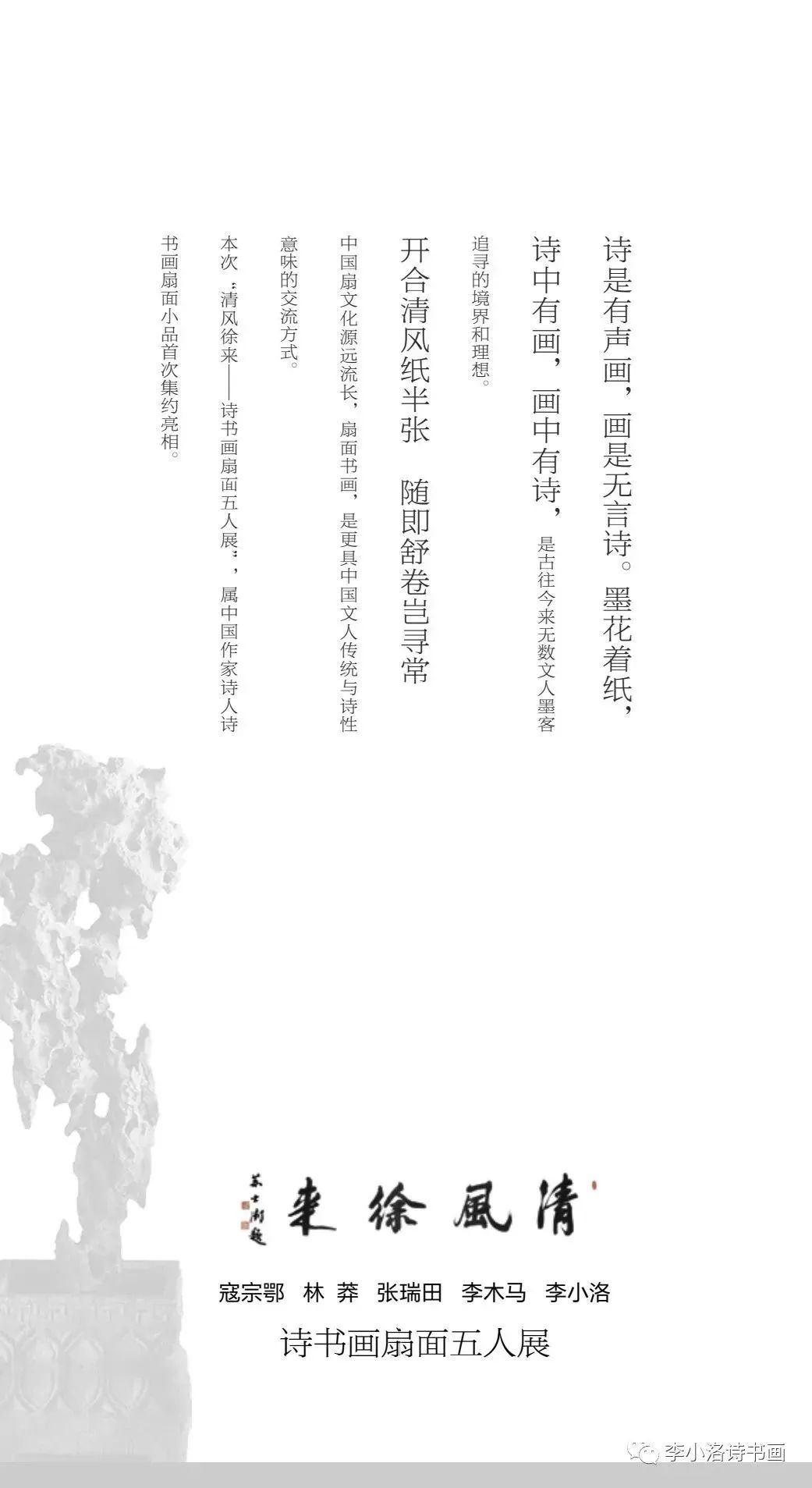 詩人寇宗鄂和林莽,均為《詩刊》編委,都曾擔(dān)任過《詩刊》的編輯部主任?茏诙踉鴰煆闹剿嫾倚毂蓖。娙伺h,詩畫兼擅。林莽作為白洋淀詩群和朦朧詩重要代表詩人,詩畫相融,桃李天下。張瑞田早年寫詩,后來多寫散文和書畫評論,是當(dāng)今活躍的評論家和書家。李木馬,李小洛,都曾參加過《詩刊》社的“青春詩會”,就讀魯迅文學(xué)院高研班,在詩歌和書畫創(chuàng)作上多年努力,取得了一定的成績……一人一格、一人一品,一扇一意、一扇一味,五位詩人作家的詩意筆墨,傳遞著各自對生活、藝術(shù)與世界的熱愛,認知與發(fā)現(xiàn)。君子和而不同,透過一幀幀詩意盎然的扇面小品,在交相輝映的筆情墨趣中,可以看到他們相互啟迪,感染和照亮的友誼與藝術(shù)追求。