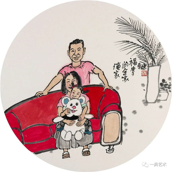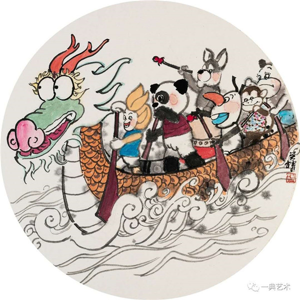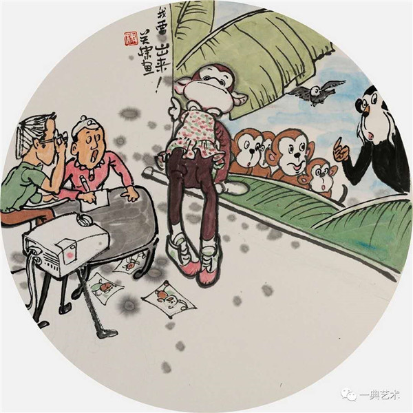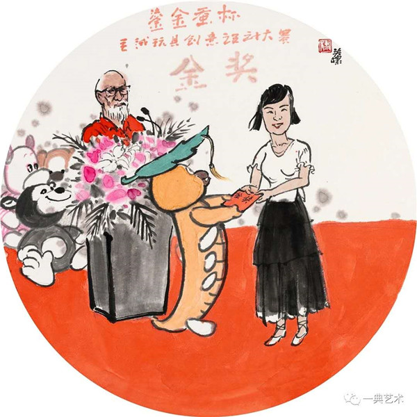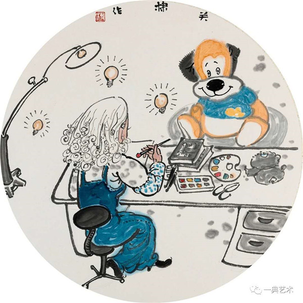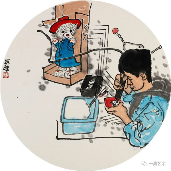 創(chuàng)作這個題材,我思考的內(nèi)容是豐富的,表達(dá)方式是明晰的,創(chuàng)作沖動是豐沛的。在初期,當(dāng)沒有門徑的時候,曾經(jīng)請人社局根據(jù)文字資料“劃重點(diǎn)”,而人社局領(lǐng)導(dǎo)給了很寬泛的態(tài)度:沒有重點(diǎn),只要和毛絨玩具相關(guān)。這一態(tài)度實(shí)際上解放了我的思想,放開了我的手腳:尋求有約束的自由——給以充分自由——自我追尋“有約束”的自由。好吧,自己給自己尋找方向!考察結(jié)束,創(chuàng)作方向已經(jīng)確定:以人和毛絨玩具作為主要表現(xiàn)內(nèi)容,以中國水(彩)墨畫為形式。在那幾天(直至今日)我頭腦里充斥著毛絨玩具和女工的形象,兩者形異神同,就像《西游記》中人神共處。因此,創(chuàng)作中我將人和物都以“人”的精神面貌進(jìn)行刻畫,為了藝術(shù)語言的統(tǒng)一,將人略作夸張,并力求“以形寫神”“形神兼?zhèn)?rdquo;,并設(shè)定一定情節(jié)性、趣味性。實(shí)際上毛絨玩具在設(shè)計(jì)過程中,應(yīng)該是運(yùn)用了文學(xué)領(lǐng)域的比喻、比擬、夸張、類比、通感等修辭手法,這也是我在創(chuàng)作中經(jīng)常用到的手法。我是一個中國畫家,因此作品強(qiáng)調(diào)中國畫的意蘊(yùn),任何時候,不忽略筆墨的表現(xiàn)。為了符合這個產(chǎn)品的特性(裝飾性、時尚性),我有意識吸取了一些水彩畫的表現(xiàn)語言。無論從思想上、技法上,不脫節(jié)傳統(tǒng)、不疏離當(dāng)代。這種表現(xiàn),(也許)增加了作品的藝術(shù)性。